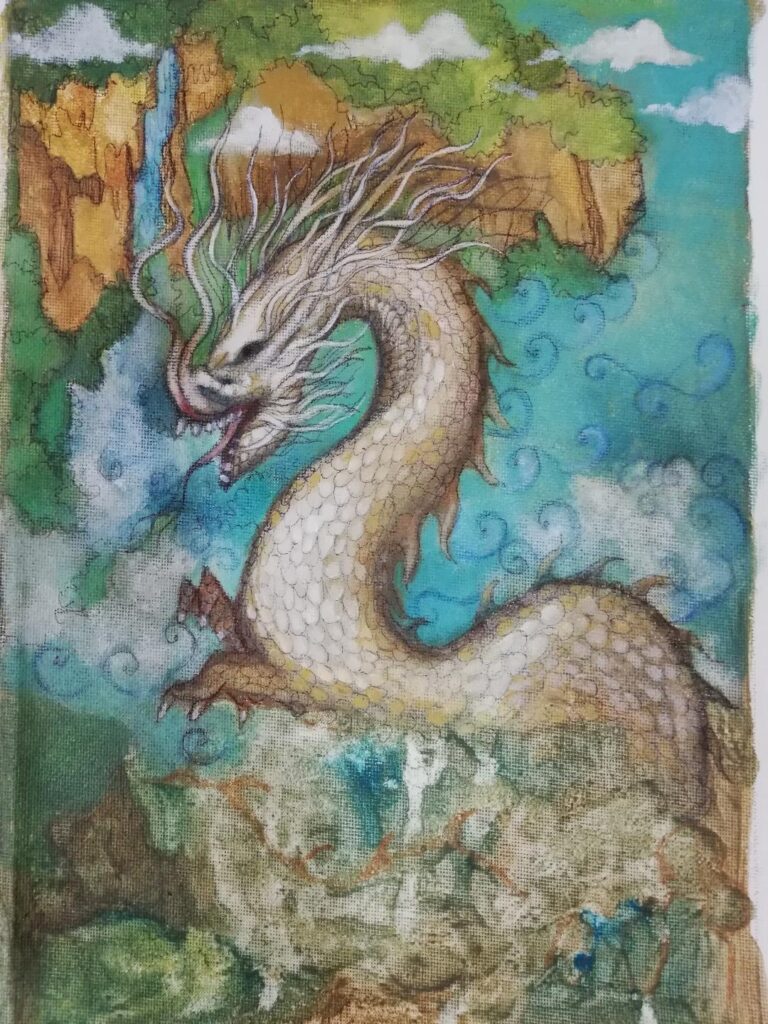 When he walked up the beach, he turned to look at his son and officers and was surprised to see the fright on their faces. He asked them why they looked so scared. His son cried out in fear and told him he had transformed. He looked at his body and then realized he had changed form into “Srisakti”, a magical dragon like beast, and he was known as Naraga (dragon).