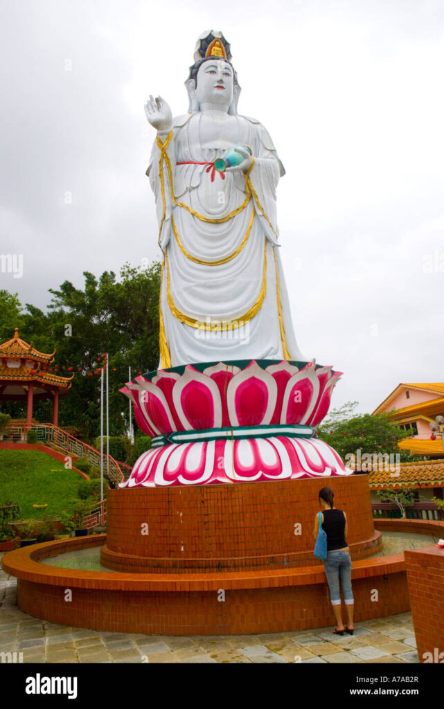 Kuan Yin, the goddess of mercy, is the most universally loved and well-known Chinese goddess. Her image is seen in most of Chinese households, and there are altars dedicated to Kuan Yin in many Chinese homes and temples in all the major towns in Sarawak. She is said to answer all prayers to those who come to her for her spiritual assistance. She is also known as the goddess of sympathy, who listens to the cries of human beings. Furthermore, she is basically of Buddhist origin, being a representation of the Buddhist Lord of Mercy, Avalokitesvara who listens to the sounds of the world. He reached China from India about the fifth century, and some centuries later he appeared in feminine form as Kuan Yin. According to the Buddhist faith, the goddess takes numerous forms but is often depicted standing or sitting, wearing a white robe and carrying a willow branch or a small vase.