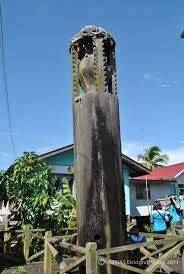 There are carved and uncarved Jerunei poles. One pole, at Kampung Angus is the tallest in the area standing surrounded by scrub and neglected vegetation and hidden among the sago palms. It is clothed with creepers and in the hollow are numerous bats. These are said to be born of the slaves who were sacrificed during the burial ceremonies.