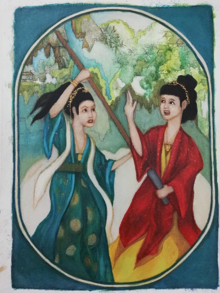 The two girls met, and a catfight broke out. Tsan Tu Bong whacked Jing Jang in the head with a Kayo Belidak. (a piece of wood used in weaving).