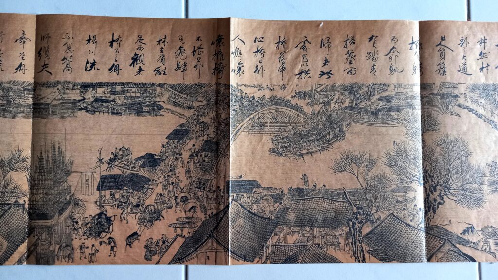 The art is a reproduction of a scroll inked during the Song Dynasty(960-1279) of the Quing Ming Festival. The festival celebrates the Chinese ancestors and the cleaning of the graves but also shows the everyday lives of the people.