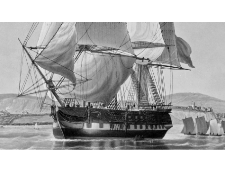 On 5 January, the ship struck the Shoals and became grounded. Realizing they were taking on water, the Captain decided to abandon the ship. The 71 sailors were divided into lifeboats and set sail for Singapore. The first lifeboat set sail for Borneo to find water. The rest made it to Singapore after a 13-day voyage. It was said pirates attacked the boats.